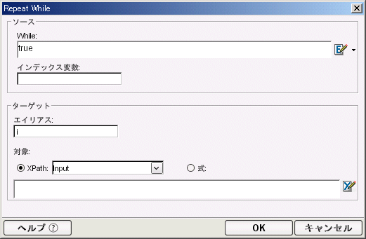 ループを作成するには、アクションモデルでRepeat Whileアクションを使用します(マウスを右クリックして[新規アクション]>[繰り返し]>[Repeat While]の順に選択します)。ダイアログボックスの設定は、次のようになります。