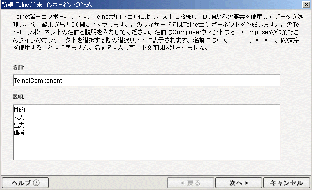 注記: または、Composerウィンドウのカテゴリペインの[コンポーネント]で、[Telnet端末]を選択し、マウスを右クリックして[新規]を選択することもできます。