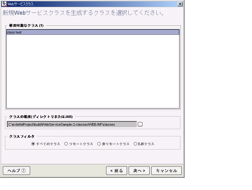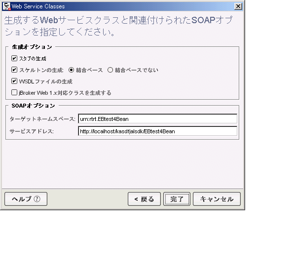 「クラス生成およびSOAPオプション」を入力するようメッセージが表示されたら、Webサービスに対して生成する1セットのソースファイルを選択して設定する必要があります。