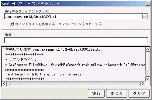 このプロジェクトを作成した後、WARファイルが作成されてJ2EEサーバに展開されると、MyObject Webサービスのテストを実行する準備が整ったことになります。 MyObjectWSClientアプリケーションを実行するためにexteNd Director 開発環境でクライアントランナーを使用した場合の結果は、次のとおりです。