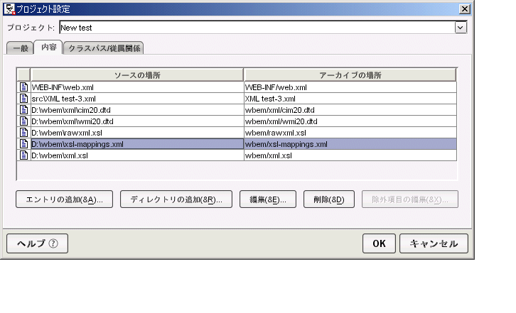 選択されたエントリのコンテンツのアーカイブがある場所です。アーカイブの場所は、ソースファイルと同じ場合と異なる場合があります。 アーカイブの場所はすべて、アーカイブルートディレクトリの相対パスです。 設定するパスによって、アーカイブ内のディレクトリ構造が識別されます。たとえば、「src\com\proverb」を指定すると、「src\com\proverb」を持つアーカイブ内のファイルおよびディレクトリが、アーカイブのディレクトリ構造として含まれます。 アスタリスク(*)は、指定したディレクトリの、ネストされたサブディレクトリを除くすべてのファイルを含ませることを示します。 |