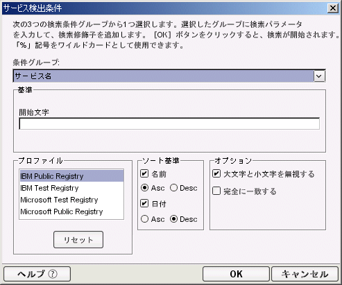 ヒント: また、縦線で区切った組織名のグループを入力すると、複数の組織グループを 検索することもできます。たとえば、次のとおりです。 XMethods|IBM|Sun.