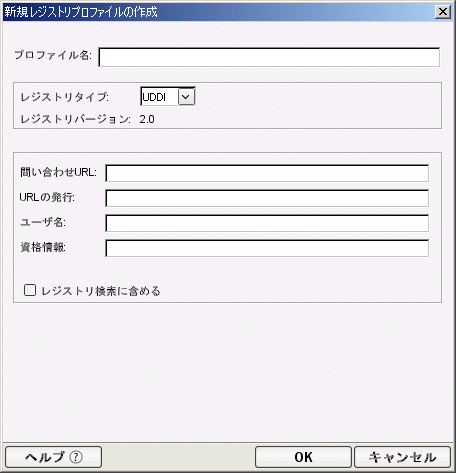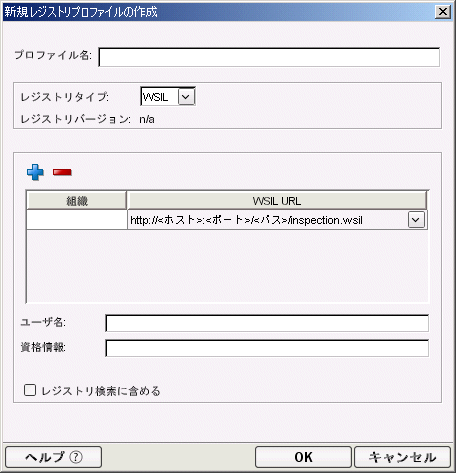 レジストリタイプ - ebXML、UDDI、またはWSIL ダイアログボックスには、選択したレジストリタイプに応じたオプションが表示されます。 |