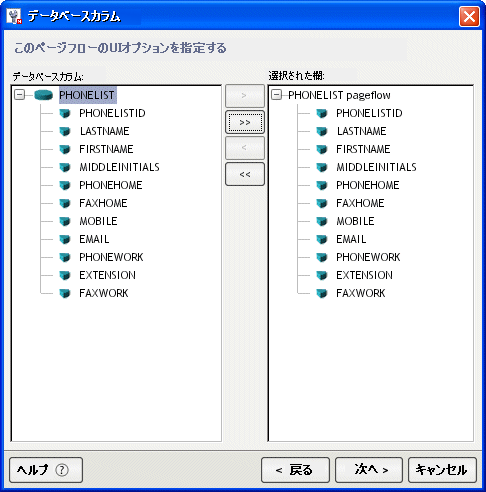 [データベースカラム]ダイアログボックスで、データベースページフローに使用する