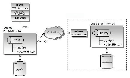 メッセージのプロデューサは、ローカルブローカを使用します。この場合、このローカルブローカは、ファイル保存を使用するように設定されています(「ライト」メッセージサーバ)。次に、ローカルブローカは、HTTPを使用してメッセージをリモートブローカに送ります。つまり、メッセージはインターネットに送られます。 リモート側では、ORBのHTTPトンネルが着信HTTPトラフィックを受信して、リモートブローカに転送します。