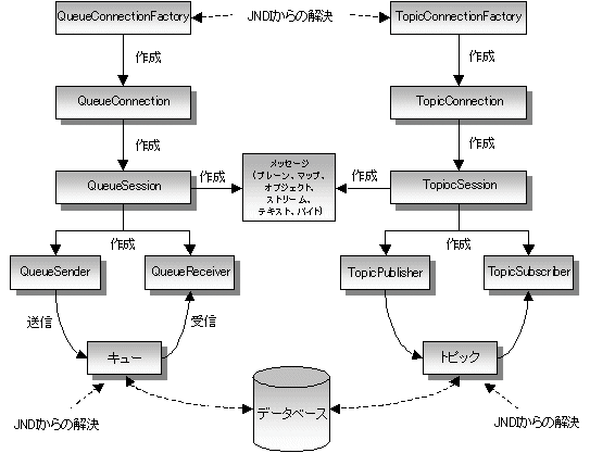 管理オブジェクトは、JMSプロバイダアプリケーションの管理者により作成されるオブジェクトです。管理オブジェクトは、JNDIネームスペースに置かれ、共通の管理コンソールから管理できます。JMSには、Destination (宛先)およびConnectionFactory (接続ファクトリ)という2つの管理オブジェクトがあります。