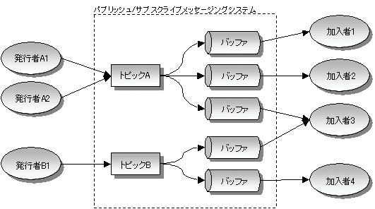 メッセージは、1つまたは複数のトピックパブリッシャによりトピックに発行されます。該当するユーザは発行されたメッセージを受信するために、1つまたは複数のトピックにサブスクライブします。トピックへのサブスクライブは、永続的または一時的のいずれかです。