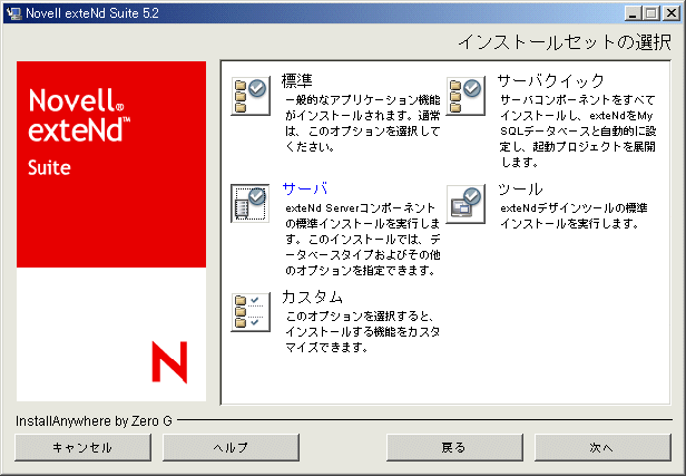 Novell exteNd製品スイートインストールプログラムを実行する([サーバ]オプションを使用)
