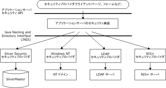 アプリケーションサーバは、固有のUNIXセキュリティとWindows NTおよびLDAP ディレクトリに接続するJNDI (Java Naming and Directory Interface)を実装します。