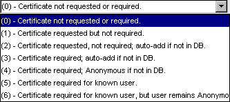 選択内容は、すべての有効なクライアント証明書をサーバがどのように処理するかを決定します。次の証明書検証表で各オプションを説明します。オプションには、0 (検証なし)から6 (最も制限の厳しいレベル)の番号がついています。