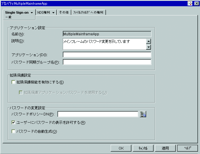 メインフレームnssoApplicationオブジェクトの[一般]ページが次に示されています。