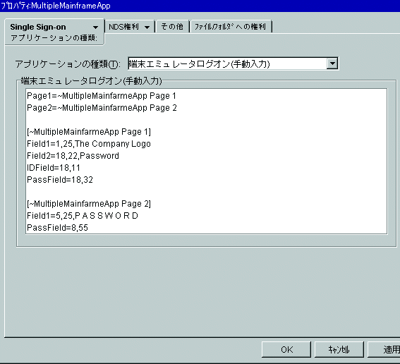 メインフレームアプリケーションの設定に使用するセクションを入力します。メインフレームアプリケーションに対して複数の画面が予想される場合、認証画面(ページ)へのポインタを設定します。1つの画面のみが予想される場合、この設定にすべての設定を含めることができます。