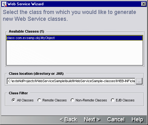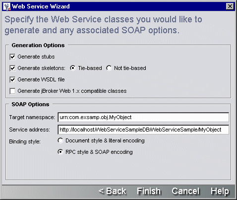「クラス生成およびSOAPオプション」を入力するようウィザードで要求されたら、Webサービスに対して生成する1セットのソースファイルを選択して設定する必要があります。