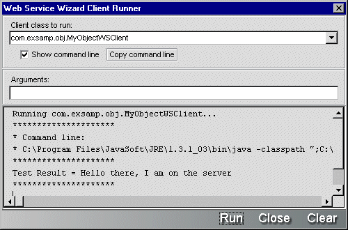 このプロジェクトを作成した後、WARファイルが作成されてJ2EEサーバに配備されると、MyObject Webサービスのテストを実行する準備が整ったことになります。MyObjectWSClientアプリケーションを実行するためにWorkbenchでClient Runnerを使用した場合の結果は、次のとおりです。