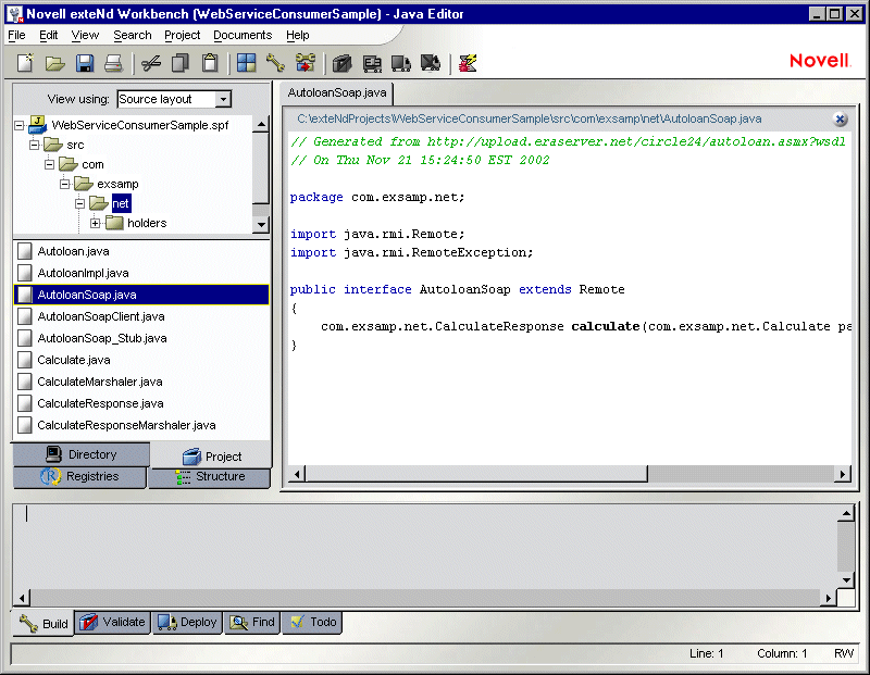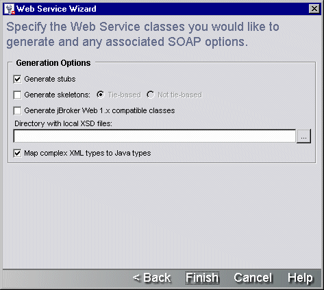 ウィザードでは、 JAX-RPC (Java API for XML-based RPC)および jBroker Web (Novell exteNdに含まれているJAX-RPX実装)に基づいて、Javaソースファイルを生成します。JAZ-RPCは、Webサービスサポートを提供するJ2EE仕様です。