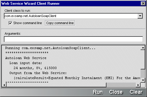 たとえば、生成されたAutoloanSoapClientクラスをClient Runnerを使用して実行すると、次のようになります。