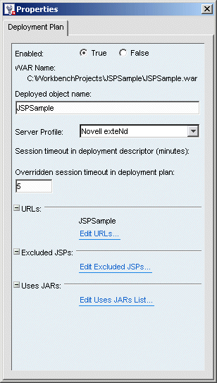 サンプルアプリケーションがNovell exteNd Application Serverで配備された方法は、次のとおりです。Novell exteNd Application Serverでは、「配備計画」、つまりWARファイルのコンテンツとその配備方法に関する追加情報を提供するXMLファイルを使用します。計画は、配備計画エディタで作成します。配備計画の詳細については、『ツールガイド』の「 配備計画エディタ」を参照してください。