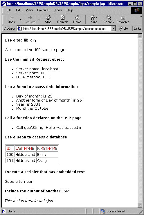 機能 サンプルページは、次を含むJSPのほとんどの機能を示しています。