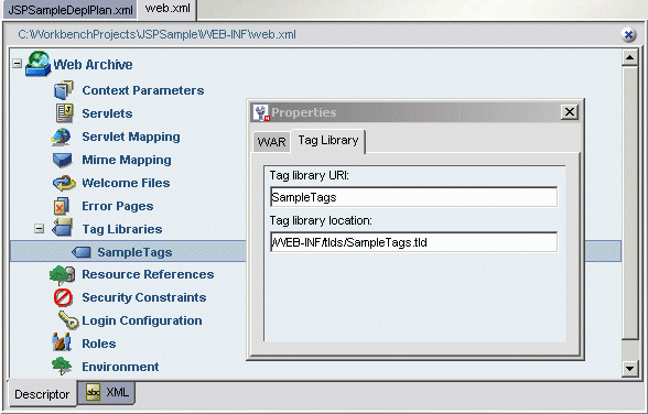 <?xml version="1.0" encoding="UTF-8"?> <!DOCTYPE web-app PUBLIC "-//Sun Microsystems, Inc.//DTD Web Application 2.2//EN" "http://java.sun.com/j2ee/dtds/web-app_2_2.dtd"> <web-app> <taglib> <taglib-uri>SampleTags</taglib-uri> <taglib-location>/WEB-INF/tlds/SampleTags.tld</taglib-location> </taglib> </web-app>