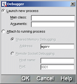SilverJ2EEClientに対するデバッグ これは、exteNd アプリケーションサーバに対するデバッグと同様の手順で行います。適切なデバッグ起動オプション( サーバの起動の説明を参照)を使用してSilverJ2EEClientを起動した後、結果として得られるデバッグアドレス(デフォルトはagjrn)またはデバッグポート(デフォルトは9901)にDebuggerを接続します。