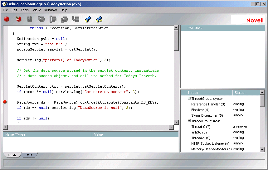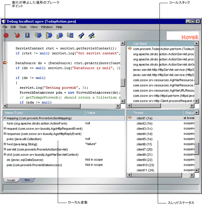デバッグするためにNovell exteNd アプリケーションサーバを起動する