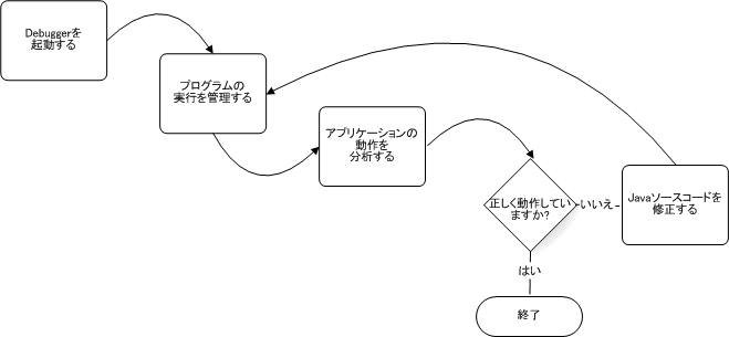 各デバッグセッションには独自の固有な作業が必要ですが、アプリケーションのトラブルシューティングの際には、通常は次のワークフローに従います。