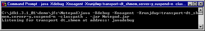この例では、JVMによってjavadebugがデバッグアドレスとして返されます。このオプションtransport=dt_shmemでは、ローカルデバッグに必要な共有メモリトランスポートが指定されます。