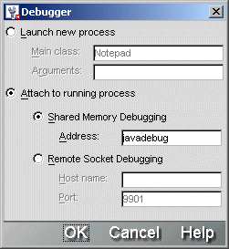 ローカルでデバッグする場合は、[Shared Memory Debugging]をオンにし、JVMによって返された「デバッグアドレス」を指定します。リモートでデバッグする場合は、[Remote Socket Debugging]をオンにし、JVMによって返された「デバッグポート」を指定します。
