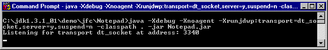この例では、JVMによって3340がデバッグポートとして返されます。このオプションtransport=dt_socketでは、リモートデバッグに必要なソケットベースのトランスポートが指定されます。