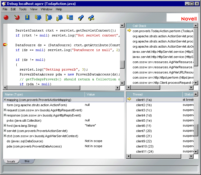 [Today\xd5 s Proverb]をクリックします。この操作によって、TodayAction.javaのコードが呼び出されます。実行は停止し(ブラウザではページの処理が完了していないことがわかります)、Debuggerウィンドウが更新されます。
