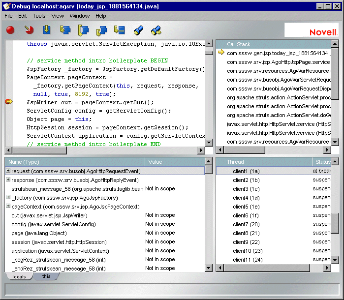 ここでは、today.jspから生成されたJavaソースファイルで実行が停止しています。
