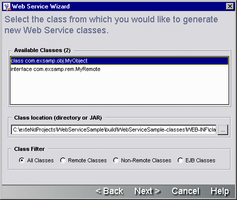 このパネルは、ウィザードがWebサービスファイルを生成するコンパイル済みのクラスを選択する場合に使用します。サポートされている選択肢は次のとおりです。