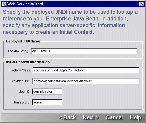 ウィザードでは、web.xml配備記述子で生成されるservlet宣言にこの情報が含まれます。ランタイム時にこの値がどのように使用されるか学習するには、xxxDelegate.javaのgetInitialContext()メソッドを参照してください。