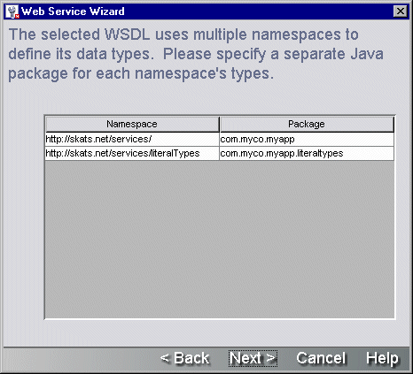 このパネルは、XMLスキーマの複雑なタイプに対して複数の名前空間が使用されているWSDLファイルから生成する場合に使用します。各名前空間を個別のJavaパッケージにマップできます。