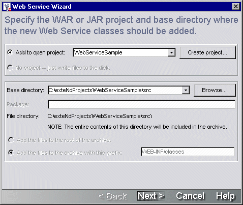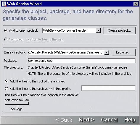 このオプションは無効になっています。Web Serviceウィザードでは、生成されたファイルは開いているプロジェクトに追加する必要があります。 |