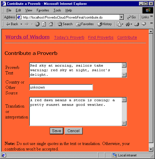 Proverbsアプリケーションでは、関連付けられたJSPページに対する事前処理およびデータセットアップを識別するために、フォームによってcontribute.doやselect.doのようなURLが使用されます。 Struts設定ファイル(後の説明を参照)では、コントローラに対する関連付けをセットアップします。