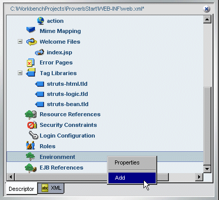 ナビゲーションペインで、プロジェクトファイルProverbStart.spfを右クリックして、ポップアップメニューから[Open Deployment Descriptor]を選択します。