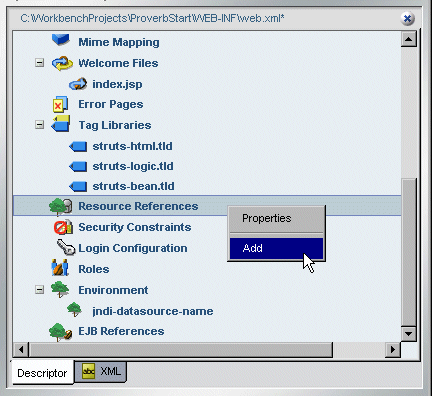 リソース参照 データベース接続の名前は、配備記述子の参照セクション内にあります。 Proverbsアプリケーションでは、次のような名前になります。