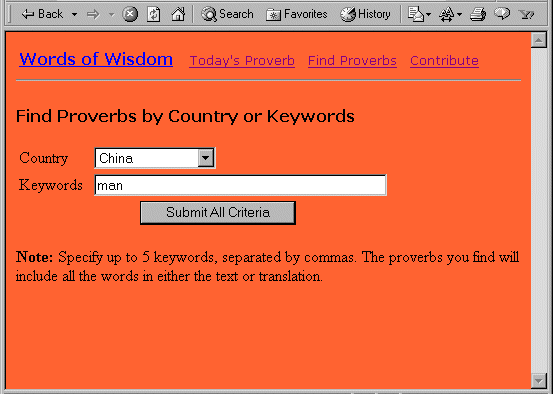 アプリケーションで、条件に一致することわざが検索された場合、Your ProverbsというタイトルのselectResults.jspが表示されます。