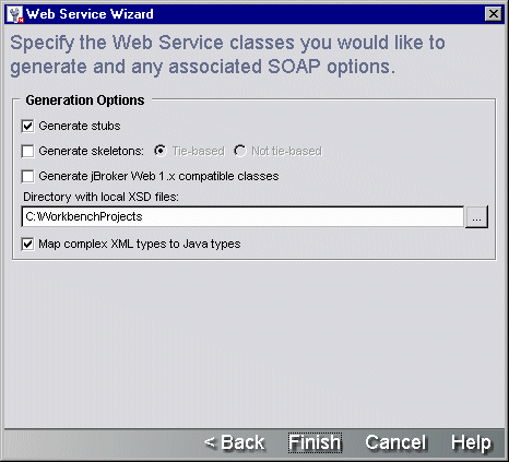 [Next]をクリックすると、WorkbenchにWeb Serviceウィザードのクラス生成およびSOAPオプション用パネルが表示されます。