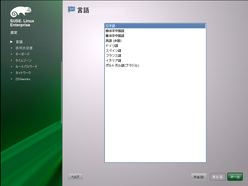 [環境設定]ウィザードの[使用言語]ページで、以後、ウィザードで使用したい言語を選択し、[]をクリックします。