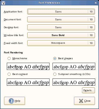 Den øvre delen av dialogboksen viser skriftene som er valgt for programmer, skrivebordet, vindustitler og en skrift med fast bredde for terminalvinduer. Klikk én av knappene for å åpne en valgdialogboks der du kan angi skriftfamilie, skriftstil og skriftstørrelse.
