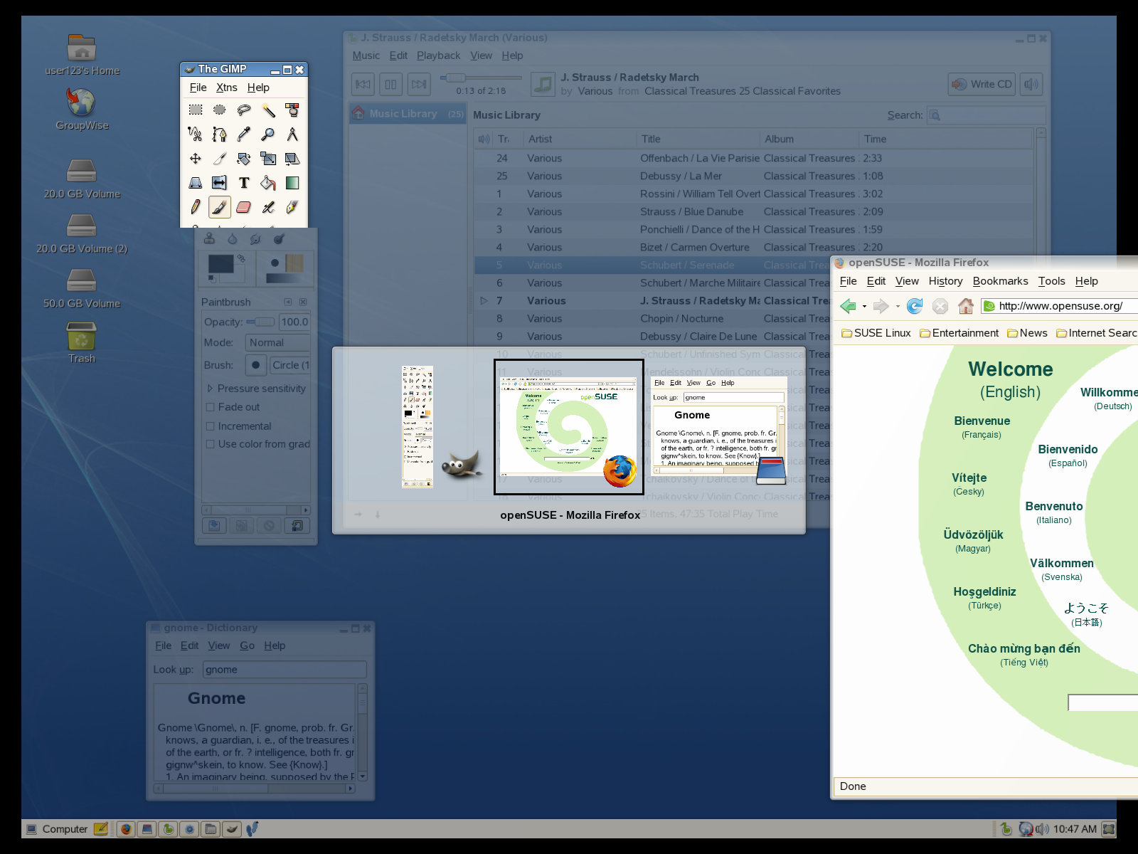 Standard skrivebordseffekter er nå aktivert. Slike effekter kan for eksempel være at vinduer "flagrer" når de kommer til syne og når du flytter dem, de tones ut når du lukker dem, og at skrivebordskuben roterer når du drar et vindu helt ut til høyre kant av skjermen. Se Endre skrivebordseffekter for informasjon om hvordan du endrer disse effektene.