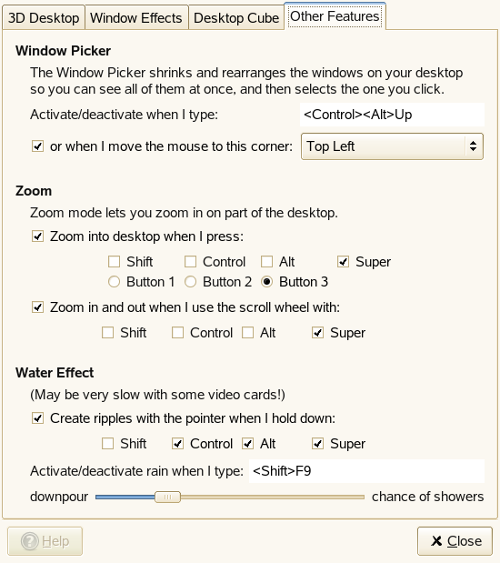 Dette alternativet lager en krusningseffekt på skjermen når du holder inne den angitte tasten eller tastekombinasjonen (Ctrl+Alt+Super som standard) og beveger musepekeren. Du kan også aktivere eller deaktivere en regneffekt når du trykker Shift+F9. Du kan endre tastetrykkene for å aktivere eller deaktivere regneffekten ved å klikke boksen til høyre for slik at vises. Deretter trykker du tastekombinasjonen du vil bruke. Den nye tastekombinasjonen vises i boksen.