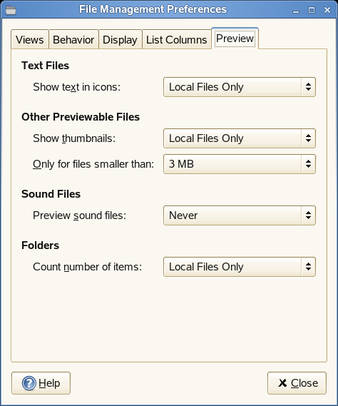 Når du skal konfigurere hvordan forhåndsvisning av filer vises i filbehandleren og om mappene skal vise antallet elementer de inneholder, velger du :