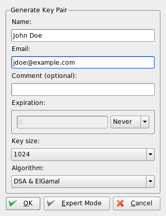 Start KGpg fra hovedmenyen eller trykk Alt+F2 og legg inn kgpg. Når du starter programmet første gang, kommer det fram en assistent for å lede deg gjennom konfigurasjonen. Følg instruksjonene dit hvor du blir bedt om å opprette en nøkkel. Legg inn et navn, en e-postadresse, og eventuelt en kommentar. Hvis du ikke liker standardinnstillingene som følger med, setter du også utløpsdatoen for nøkkelen, nøkkelstørrelsen og krypteringsalgoritmen som brukes. Se Figur 10-1.