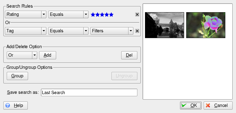 Enhver bildesamling blir umulig å håndtere hvis du ikke finner en metode du kan bruke til å søke etter bildene du trenger, og finne dem uten altfor mye styr. Det finnes to søkealternativer i digiKam som du kan bruke til å organisere samlingen din:
