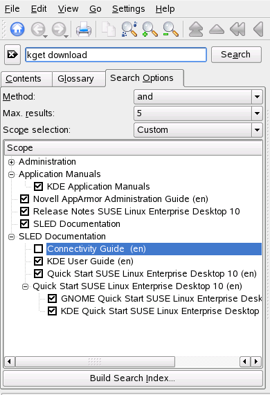 Viser en trevisning av all tilgjengelige informasjonskilder. Hjelpesenteret kan hjelpe forskjellige målgrupper, som brukere, administratorer og utviklere. Klikk på bokikonene hvis du vil åpne og se på de forskjellige kategoriene. Under overskriften , kan du f.eks. også bla gjennom håndbøker (man) og informasjonssider (info) som assosieres med kommandolinje-programmer. Hjelpesenteret gir også tilgang til noen nettbaserte databaser som dekker spesielle maskin- og programvareproblemer rundt ditt produkt. Alle disse kildene kan du søke igjennom så snart det har blitt generert en søkeindeks.