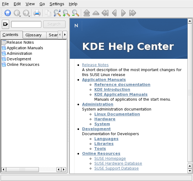 Du kan få tilgang til hjelpesenteret på forskjellige måter: Ved å klikke på i et program, eller trykkeF1, blir du tatt med direkte til programmets dokumentasjon på hjelpesenteret. Men hvis du starter hjelpesenteret fra hovedmenyen, eller ved å skrive inn kommandoen susehelp, blir du tatt med til hovedvinduet i hjelpesenteret, som vist nedenfor: