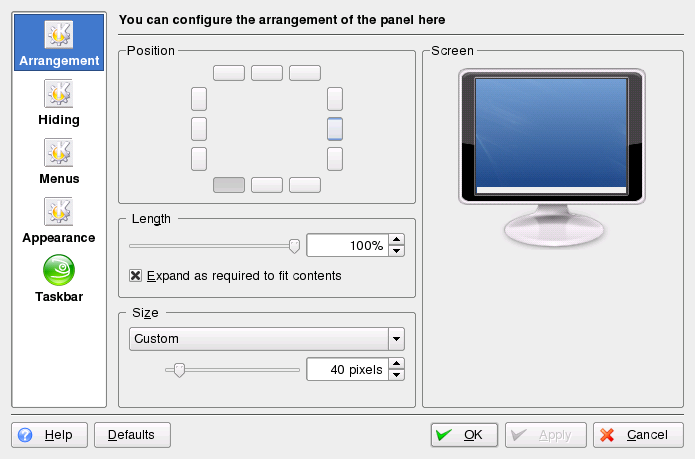 På samme måte kan du også flytte områder av panelet, som skrivebordsforhåndsvisning, oppgavelinjen, og systemstatusfeltet: Hold musemarkøren over kanten på området, og klikk den lille svarte pilen som vises der. Fra kontekst-menyen velger du . Klikk på nytt for å sette inn området i den nye posisjonen.